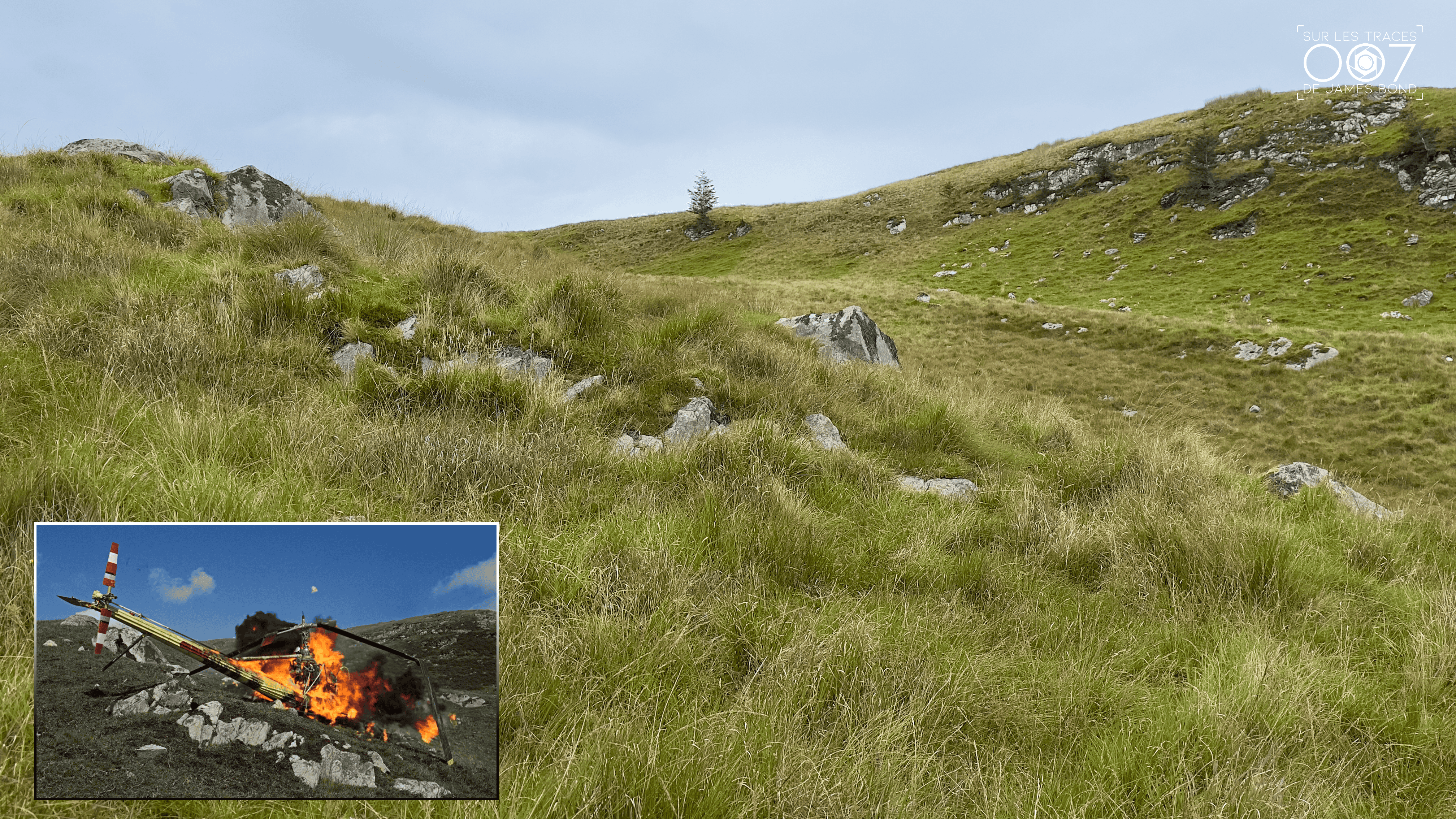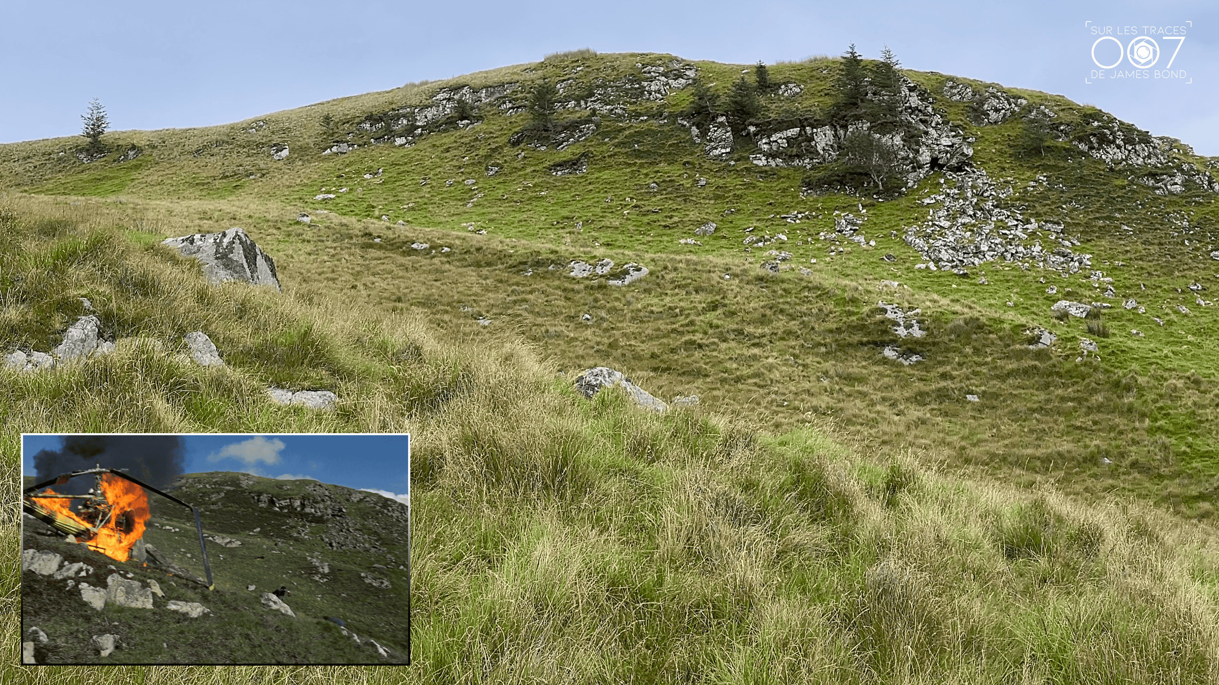 En prenant un peu de recul, on retrouve les plans de l’hélicoptère en flammes — on distingue bien le rocher à côté de l’appareil.
