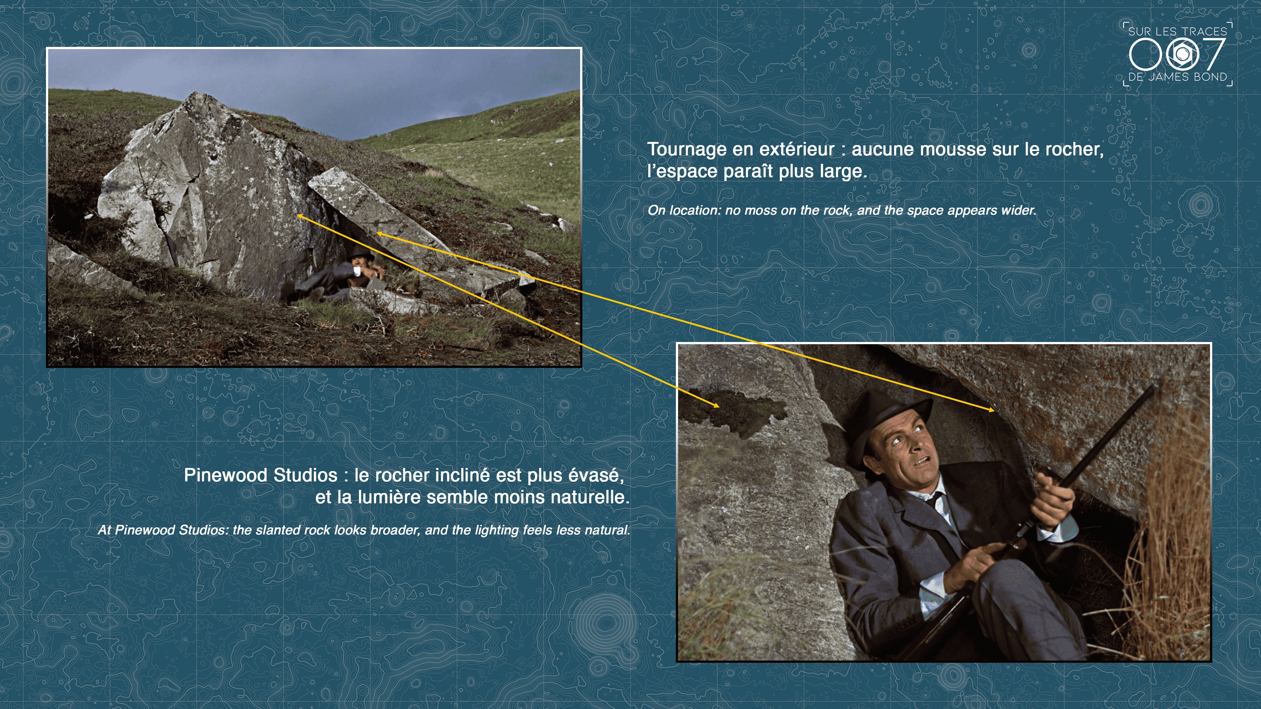 Tous les gros plans de Connery ayant été tournés en studio (comme c’était souvent le cas à l’époque, pour mieux maîtriser la lumière), il est plausible que la production ait apporté un rocher factice, construit spécialement pour l’occasion.