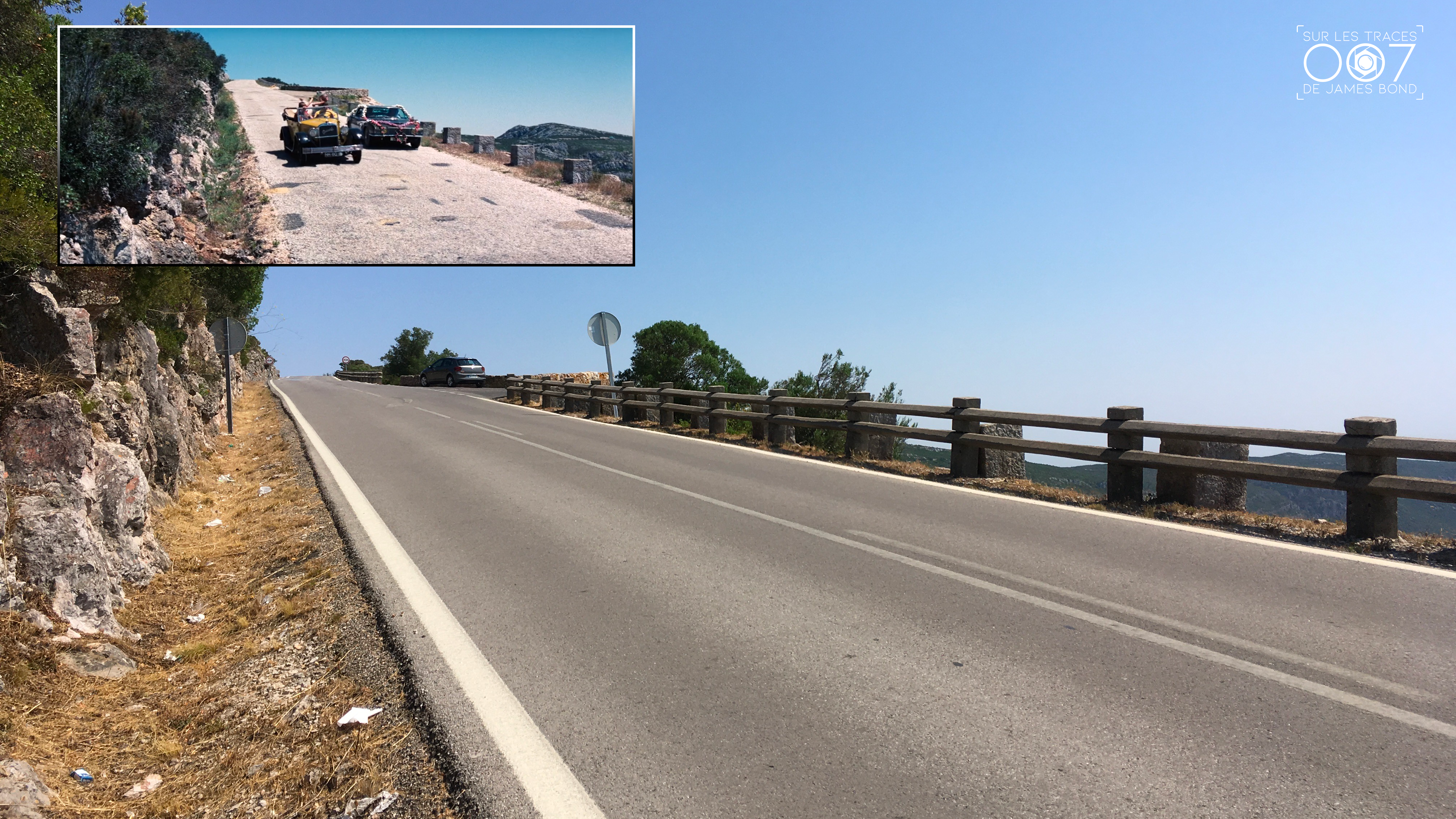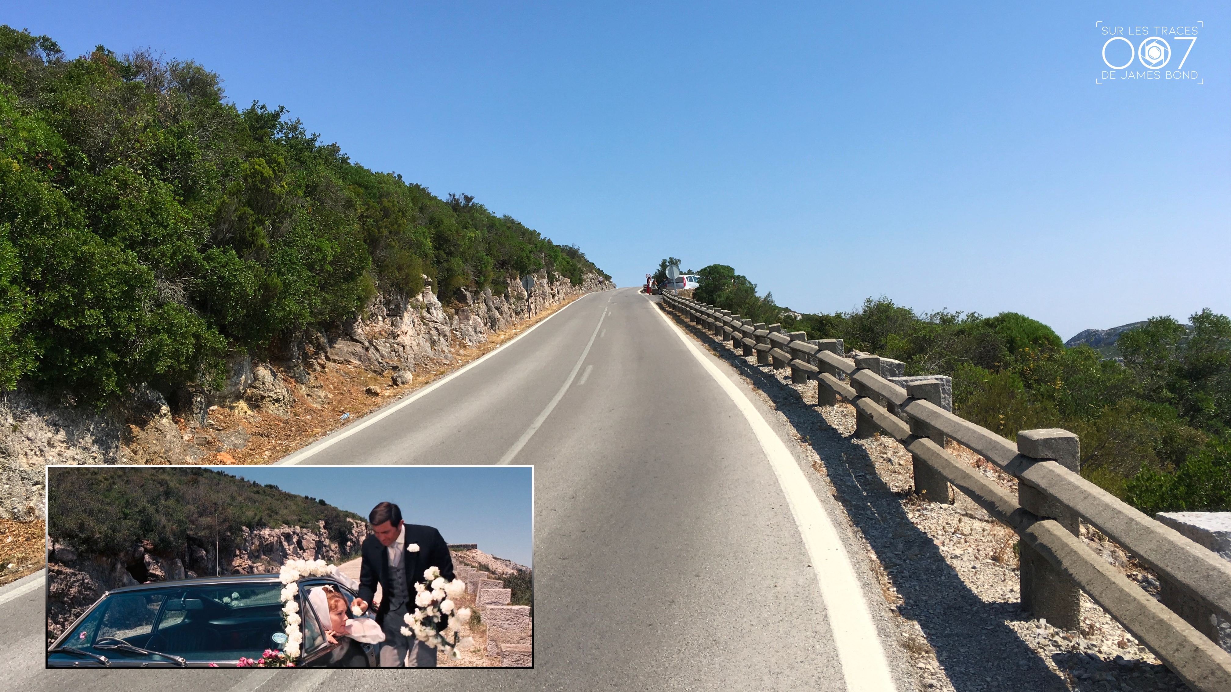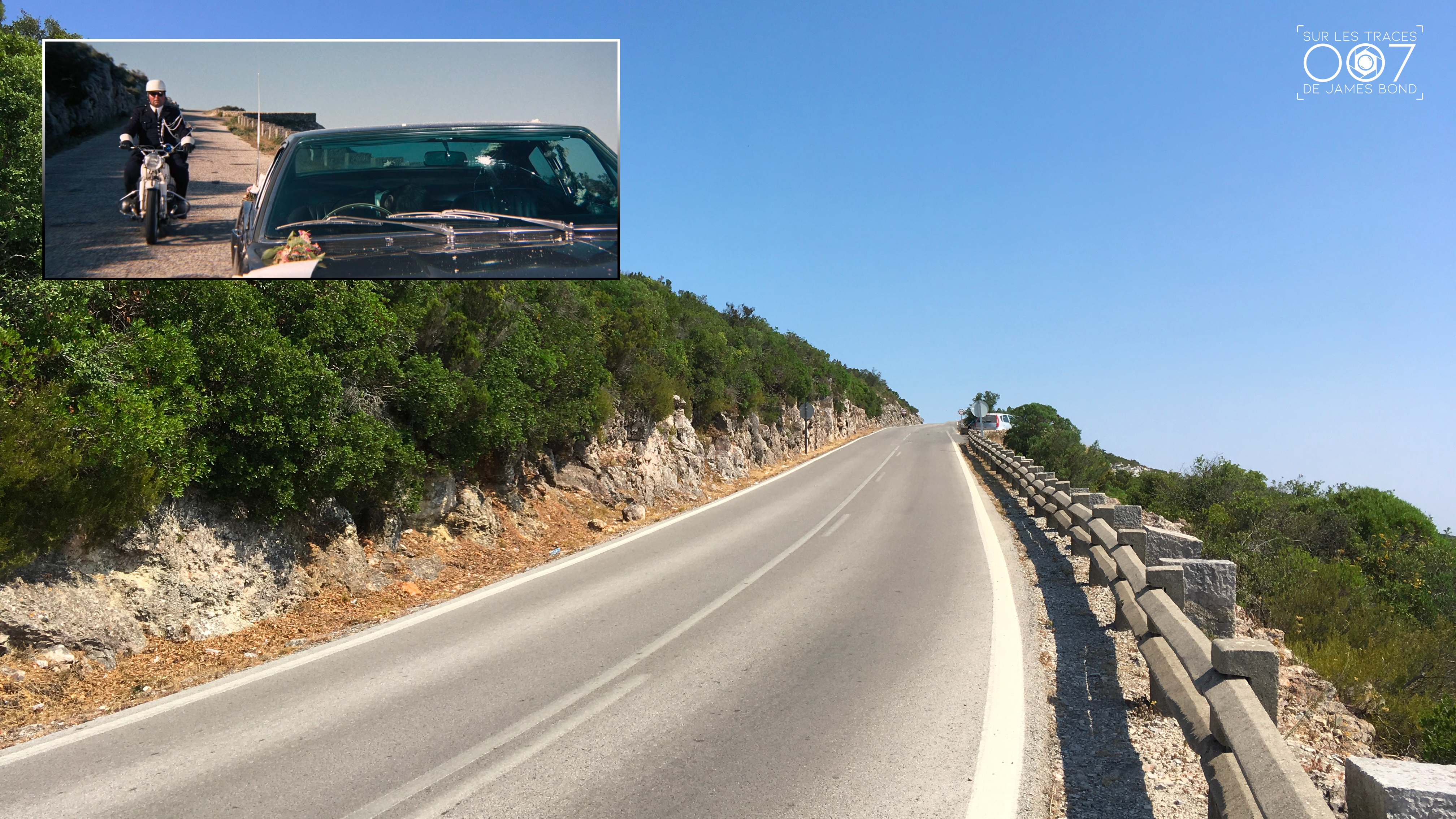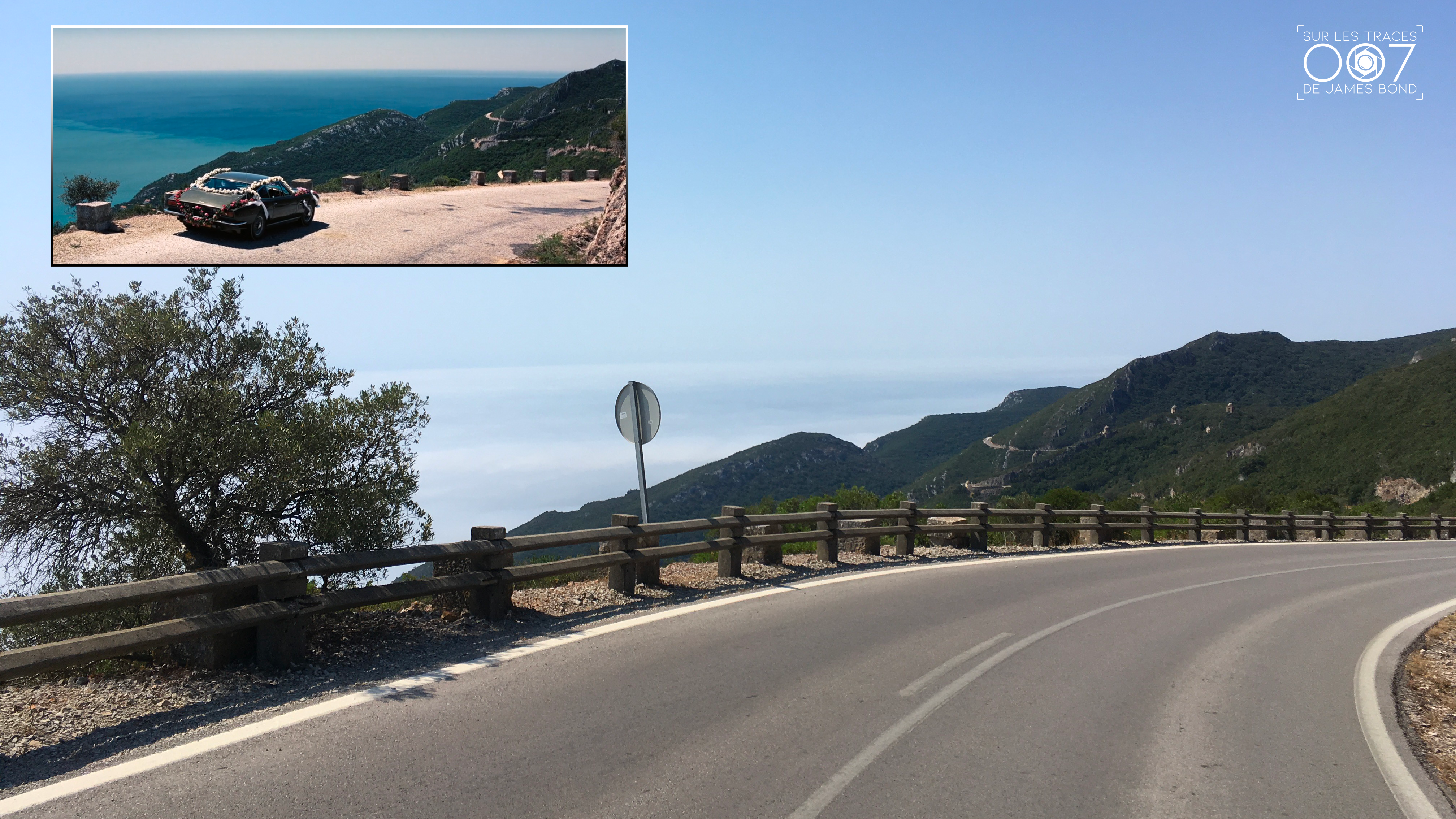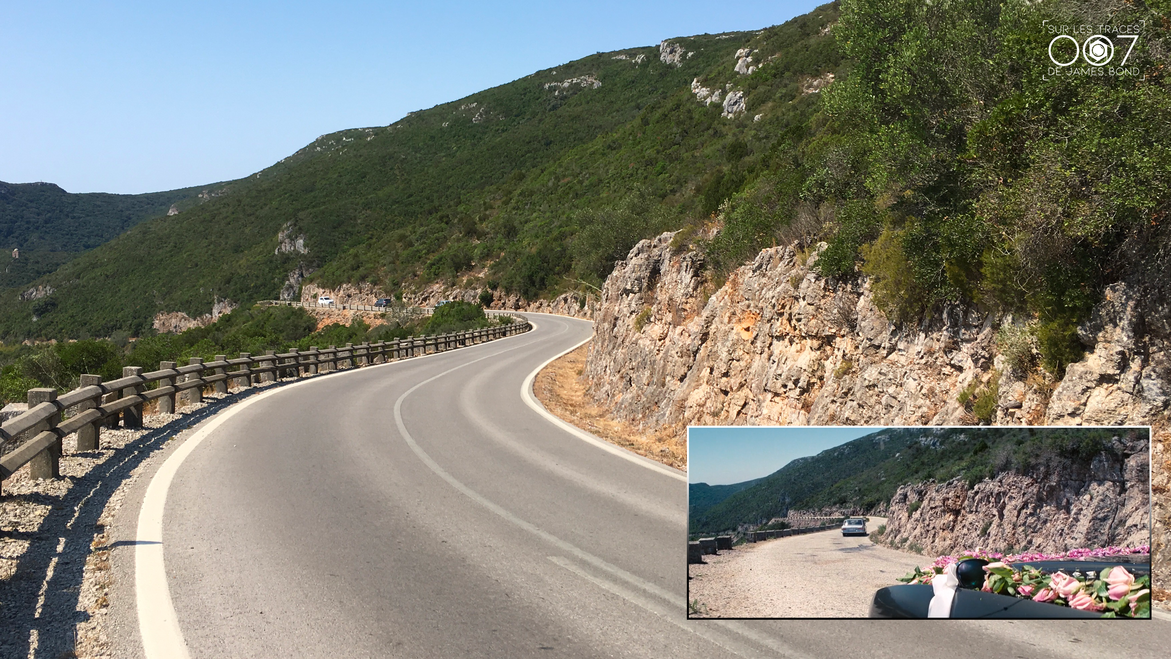 Bien que la route présente certaines similitudes visuelles avec la scène d’introduction de Bond vers la plage de Guincho, Peter Hunt choisit tout de même cette portion du parc naturel d’Arrábida et sa vue imprenable sur l’Atlantiquecomme toile de fond de la fin déchirante du film.