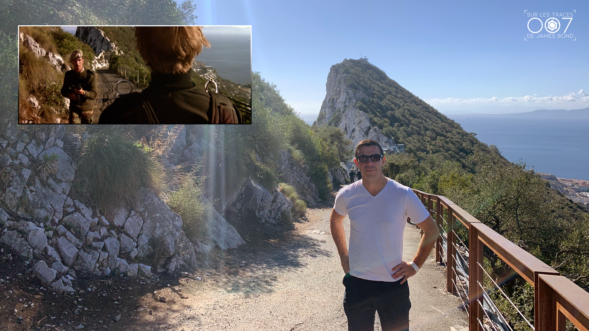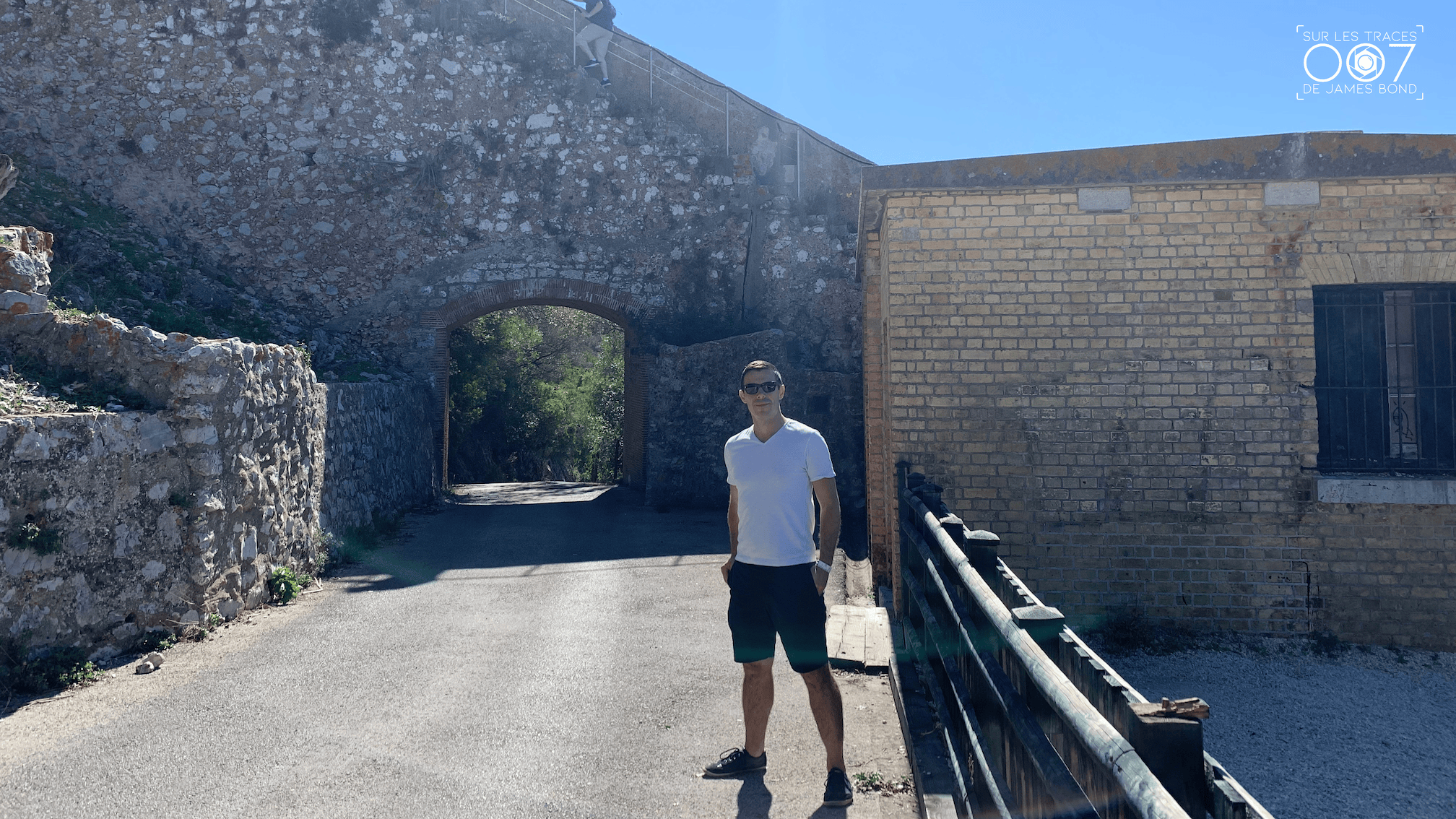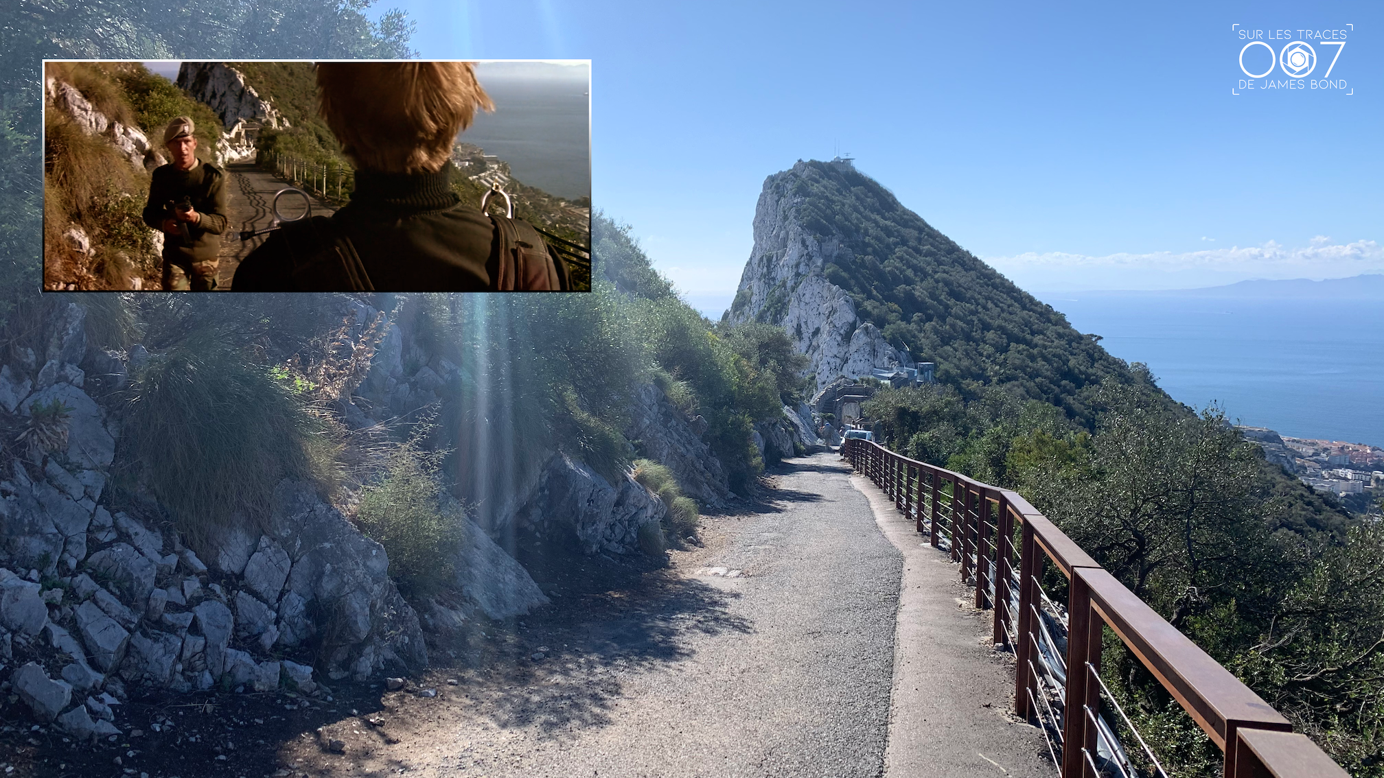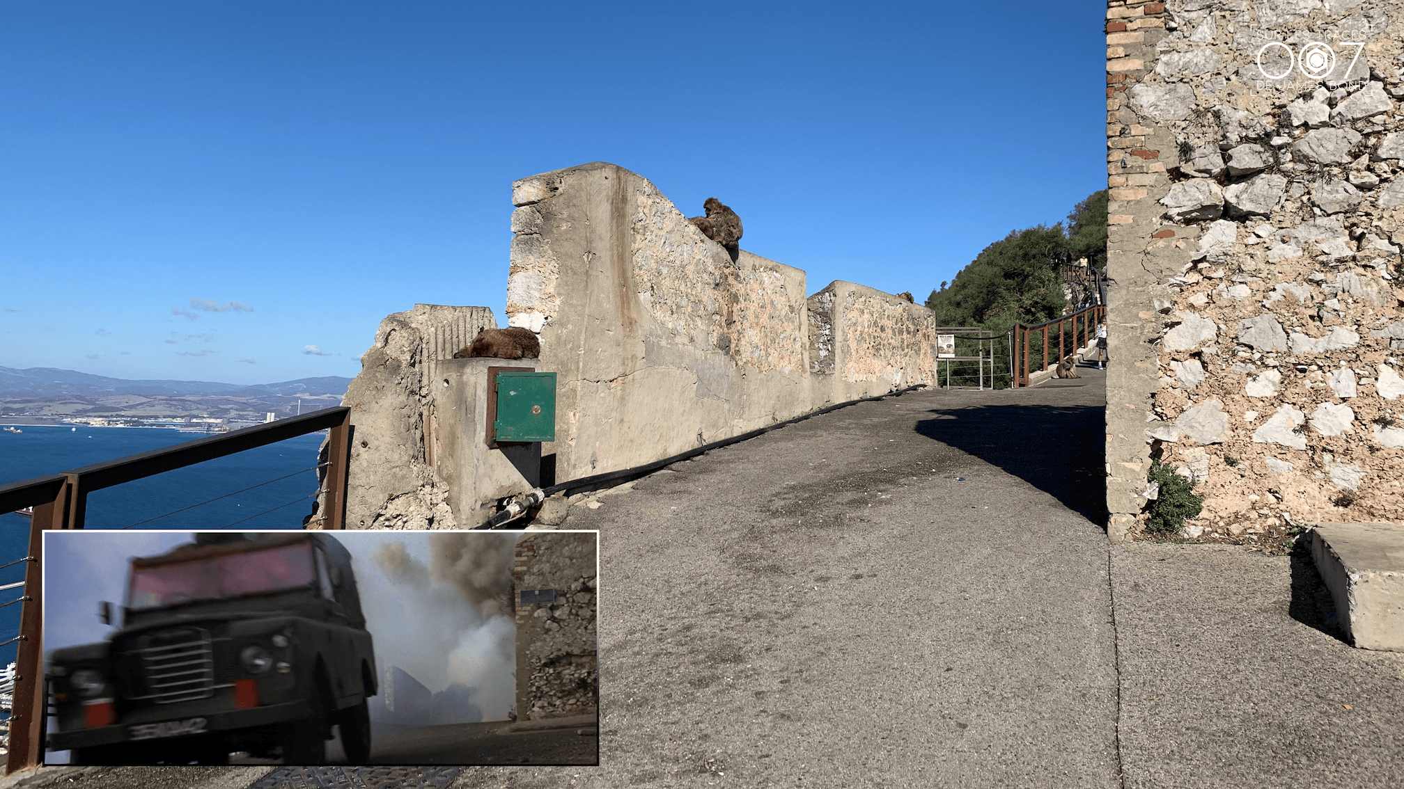 Plus bas, on rejoint l’endroit où Bond échappe de justesse à la décapitation sur le toit de la Range Rover. La scène a été tournée sur la Charles V Wall Road, sous l’un des passages du mur. Construit au XVIᵉ siècle, il renforçait les défenses naturelles offertes par les falaises. Aujourd’hui, il offre une vue saisissante sur le détroit de Gibraltar. La pente est redoutable : mieux vaut descendre que monter !