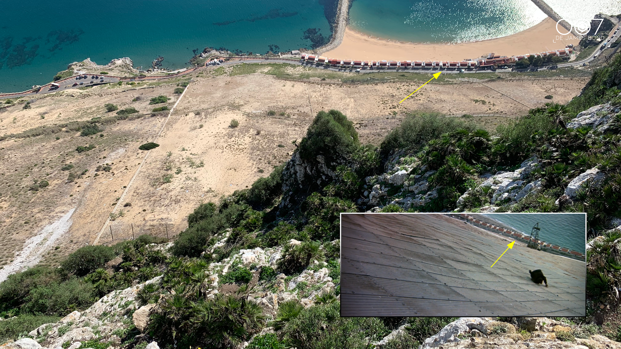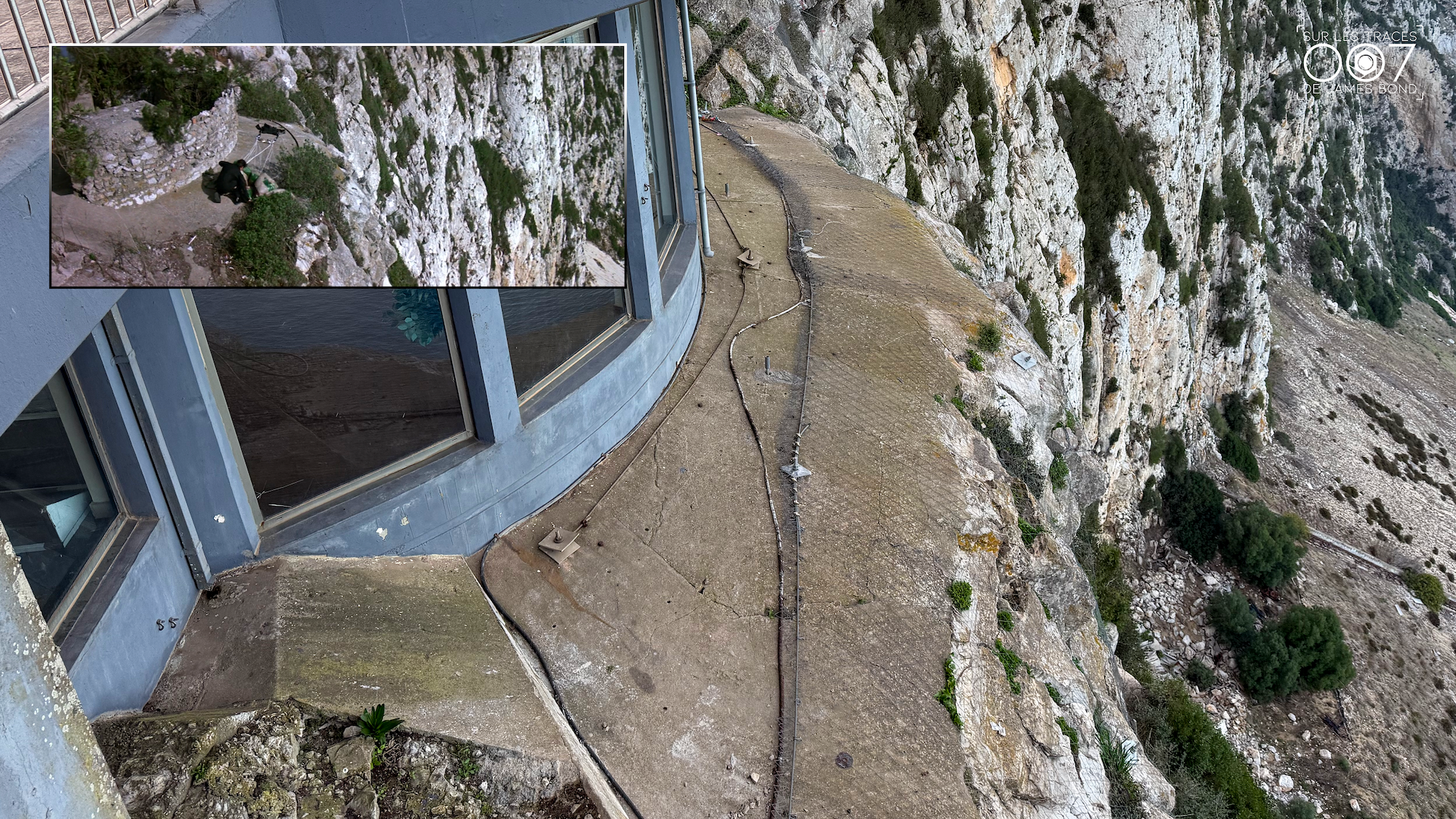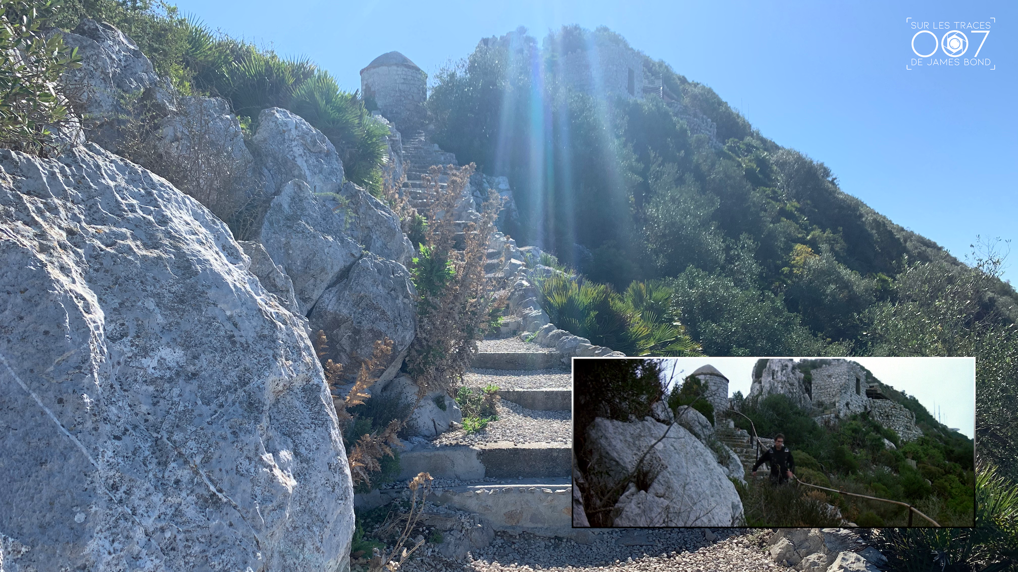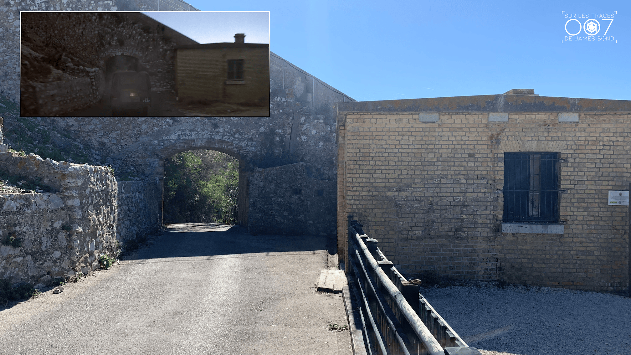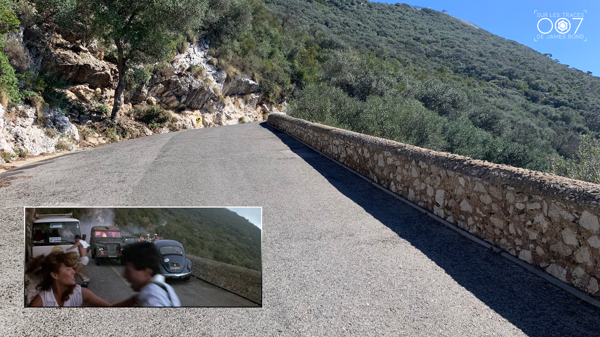 Plus bas, on rejoint l’endroit où Bond échappe de justesse à la décapitation sur le toit de la Range Rover. La scène a été tournée sur la Charles V Wall Road, sous l’un des passages du mur. Construit au XVIᵉ siècle, il renforçait les défenses naturelles offertes par les falaises. Aujourd’hui, il offre une vue saisissante sur le détroit de Gibraltar. La pente est redoutable : mieux vaut descendre que monter !